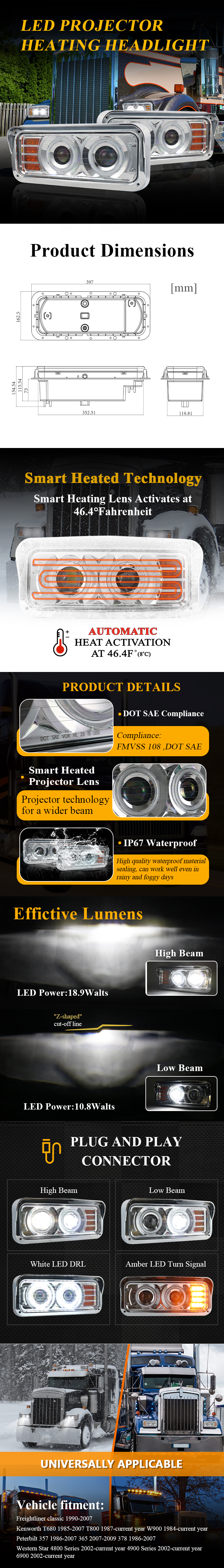 Optical grade projector optics with precise pattern and meets legal requirements Anti-fog and hard-coated PC lens, abrasion and UV resistant Automatically de-ices headlight according to ambient temperature Die-cast casing with improved heat sink for effective thermal management and additional protection from salt spray Transient, reverse-polarity, over-voltage and EMI protection